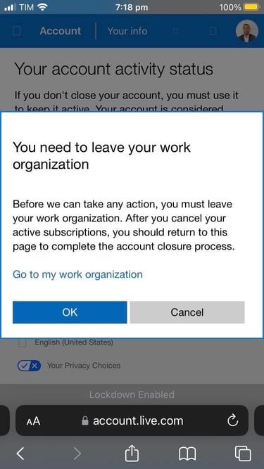 - Impossibility to close accounts, credentials and fake accounts because of the presence of assiduous hacking activity on it like the attachment below. I cannot leave and close an expired Microsoft subscription because I belong to an organization I never have belonged to.