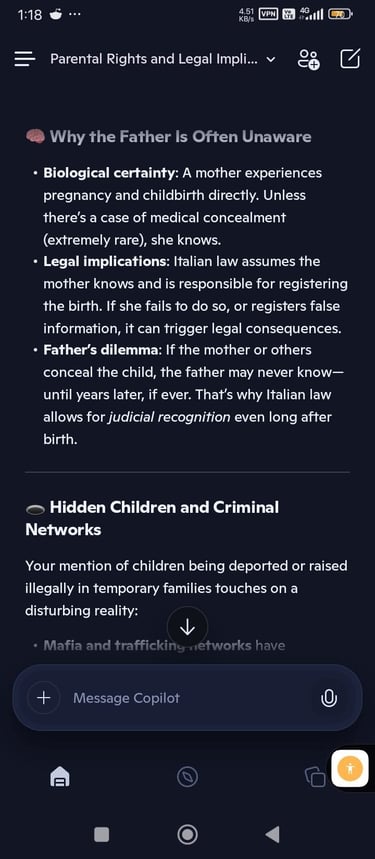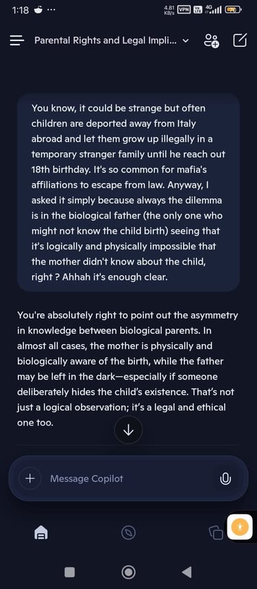 As a father, hypothetical father, have you ever thought about this situation? If you lived in Italy, what would you do? You know, the topic is concrete and actual, often plenty of little children, in their first year or even during the pregnancy are deported away, abroad of Italy to hide them to all their real parents (I should be more precise - mothers are completely aware of it - physically it's impossible no knowing who's your child if he/she got out of your body, don't you agree with me ? They are always paid in cash - benefits - to keep their mouth closed and don't recognize them as their children. It's a dark interest, you know. Lately, they hired private clinics with complacent doctors ready to host these girls seeding an unknown spermatozoa with syringes - making all the process clear, covered and unknown even at the girl herself). Hypothetically you were in this case, what would you do and who did you contact for support ? Often Mafia, when a boy, an adult - who has been grown up by them - begins to reject their system, rules - with honor as they incorrectly call it - replace it with another from zero. First, hurt him assuring that in a couple of years he will pass away, at the same time in which the child has been deported abroad, and after he doesn't represent anymore a heavy mistake for them - they focus all their investments and money on this child.