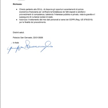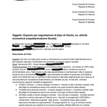 Ritengo che i fatti descritti possano integrare fattispecie di reato quali frode fiscale, truffa oltre che ad ipotesi di falso in atto pubblico in violazione delle norme vigenti. Si prega Sig. vostra di controllare la veridicitá di quanto conferito a mezzo esposto in merito ai fatti suindicati Al fine di far emergere un Quadro più veritiero viste le circostanze e palese abuso di potere delle Parti visto il mio attuale status quo.