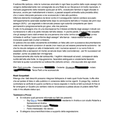 Il sottoscritto ipotizza, viste le numerose anomalie in ogni fase (a partire dalle copie assegni che vengono deliberatamente non consegnate da una filiale la cui rilevanza è di livello nazionale, il mancato pagamento della restante quota pari al 50%, vicissitudini familiari e legali sfociate in denunce, anche per maltrattamenti e lesioni, a passati sospetti antimafia sulla predetta ditta) che ci siano interposte persone a me sconosciute in tale atto pubblico.