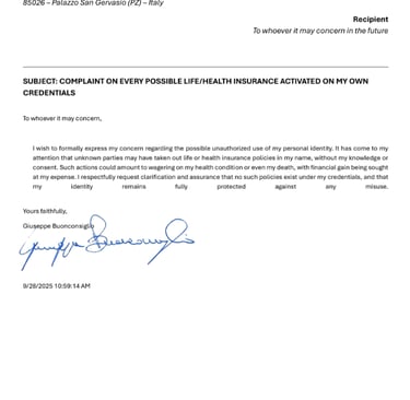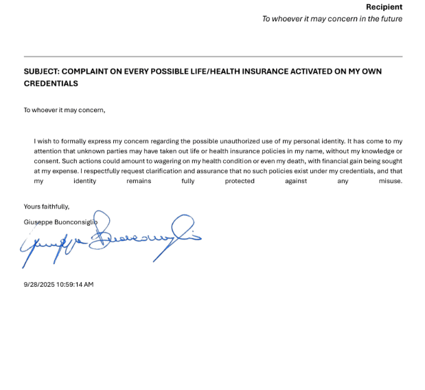 I wish to formally express my concern regarding the possible unauthorized use of my personal identity. It has come to my attention that unknown parties may have taken out life or health insurance policies in my name, without my knowledge or consent. Such actions could amount to wagering on my health condition or even my death, with financial gain being sought at my expense. I respectfully request clarification and assurance that no such policies exist under my credentials, and that my identity remains fully protected against any misuse.