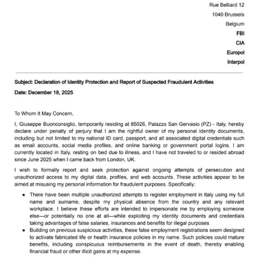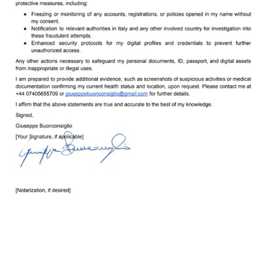 I, Giuseppe Buonconsiglio, temporarily residing at 85026, Palazzo San Gervasio (PZ) - Italy, hereby declare under penalty of perjury that I am the rightful owner of my personal identity documents, including but not limited to my national ID card, passport, and all associated digital credentials such as email accounts, social media profiles, and online banking or government portal logins. I am currently located in Italy, resting on bed due to illness, and I have not traveled to or resided abroad since June 2025 when I came back from London, UK.