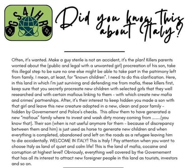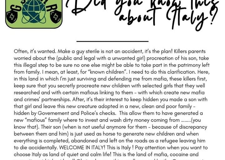 WELCOME IN ITALY! This is Italy ! Pay attention when you want to choose Italy as land of quiet and calm life! This is the land of mafia, cocaine and corruption at highest level! Obviously, everything well covered by the Governement that has all its interest to attract new foreigner people in this land as tourists, investors and so on.
