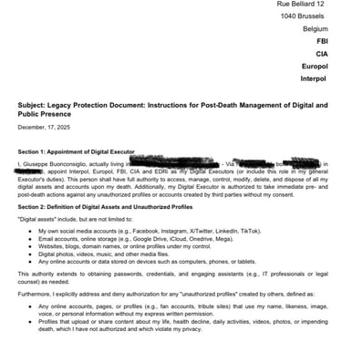 I, Giuseppe Buonconsiglio, actually living in ***************** (**) - Italy - Via Nino ********, born in ***** (**) in *****/1993, appoint Interpol, Europol, FBI, CIA and EDRi as my Digital Executors (or include this role in my general Executor's duties). This person shall have full authority to access, manage, control, modify, delete, and dispose of all my digital assets and accounts upon my death. Additionally, my Digital Executor is authorized to take immediate pre- and post-death actions against any unauthorized profiles or accounts created by third parties without my consent.