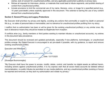 To protect my legacy, privacy, and dignity, I explicitly deny permission for any form of tribute profile, memorial account, posthumous commemoration, or continuation of unauthorized profiles on social media or online platforms. My Digital Executor is directed to: