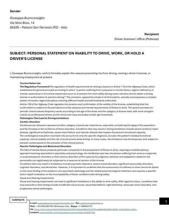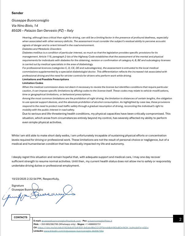 I, Giuseppe Buonconsiglio, wish to formally explain the reasons preventing me from driving, owning a driver’s license, or maintaining employment at present.