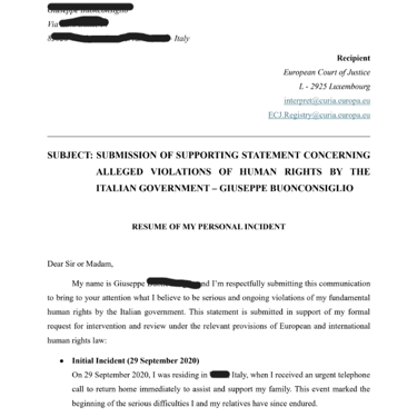 SUBMISSION OF SUPPORTING STATEMENT CONCERNINGALLEGED VIOLATIONS OF HUMAN RIGHTS BY THE ITALIAN GOVERNMENT – GIUSEPPE BUONCONSIGLIO