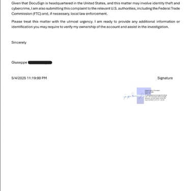 At this time, I do not know whether any documents have already been signed fraudulently, but the potential misuse of my digital signature has serious legal implications. I am therefore requesting the following: Immediate freezing or deactivation of my DocuSign account to prevent any unauthorized use.