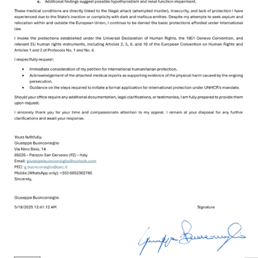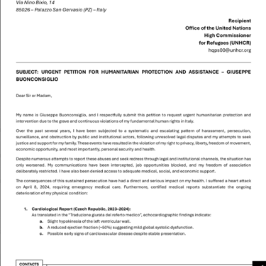My name is Giuseppe Buonconsiglio, and I respectfully submit this petition to request urgent humanitarian protection and intervention due to the grave and continuous violations of my fundamental human rights in Italy.
