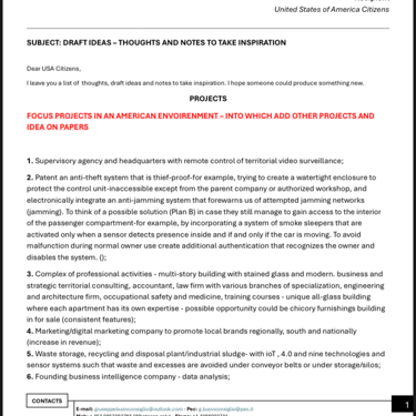 Good morning USA Citizens, I attach here all my ideas, drafts, business thoughts could help someone build something new and make USA a better place in which to live despite what is known in the rest of the world, where everything is hidden and masked to advertise them as a good location. Trust me. It’s false. I fell sick just because of the pleasure to come in USA. Jealousy and envy often make human beings dangerous creatures that should disappear forever without thinking a sec.